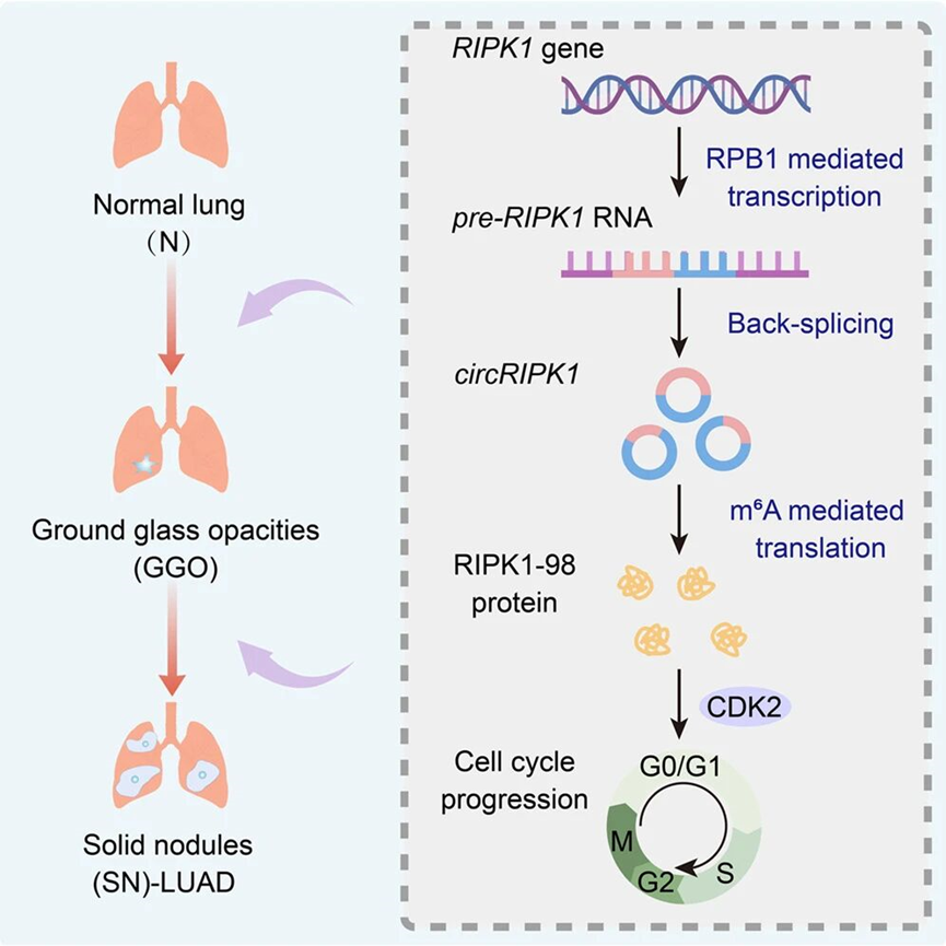 在该研究中,研究人员整合多组学数据,对来源于人类组织样本的circRNA翻译产物进行了系统挖掘与功能解析,鉴定出一批此前未被报道的蛋白质,并进一步阐明其在肺腺癌(LUAD)发生发展过程中的生物学作用:RNA 聚合酶Ⅱ关键亚基RPB1介导的前体mRNA转录过程,是这些circRNA来源蛋白生成的重要基础。进一步的功能实验与临床相关性分析显示,这些蛋白的表达水平与肺腺癌患者不同分期之间呈现显著关联。其中,由circRIPK1翻译产生的蛋白RIPK1-98被证明在功能上有别于其线性母体基因RIPK1,而RIPK1-98可通过调控CDK2依赖的细胞周期过程,显著促进肿瘤细胞增殖,这一效应在体外细胞模型及体内动物实验中均得到验证。